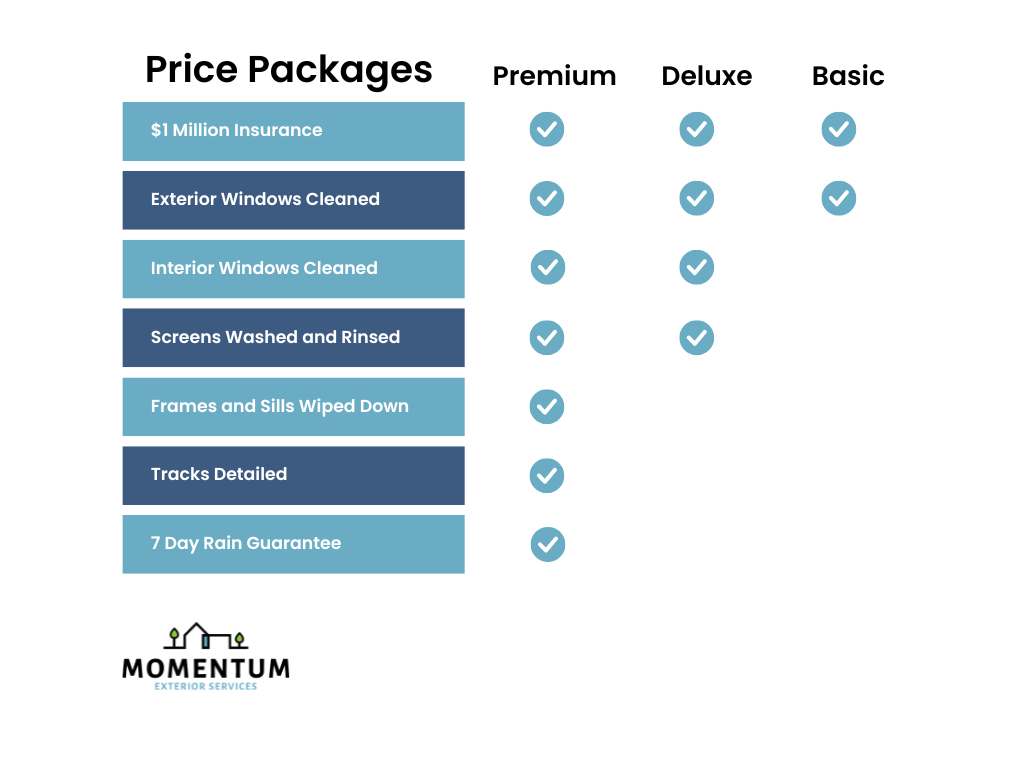 Because of its inexact nature, we have chosen to try to shoot a little on the high-side.  We do this to help avoid surprises, but even then, the amount of windows and screens will directly impact the actual cost of the job– up or down.  We’re happy to adjust the bid when we get there but before we begin the work. This bid assumes regular cleaning practices, which doesn’t include hard water removal, razor usage, screen repair, construction cleaning, or any acid treatment of your windows. We do offer these services, but they require an extra charge and in some cases a waiver to be signed.  If you think any of these extenuating circumstances might be an issue on your project, let us know when we’re scheduling and we’d be happy to work with you toward meeting all of your needs!